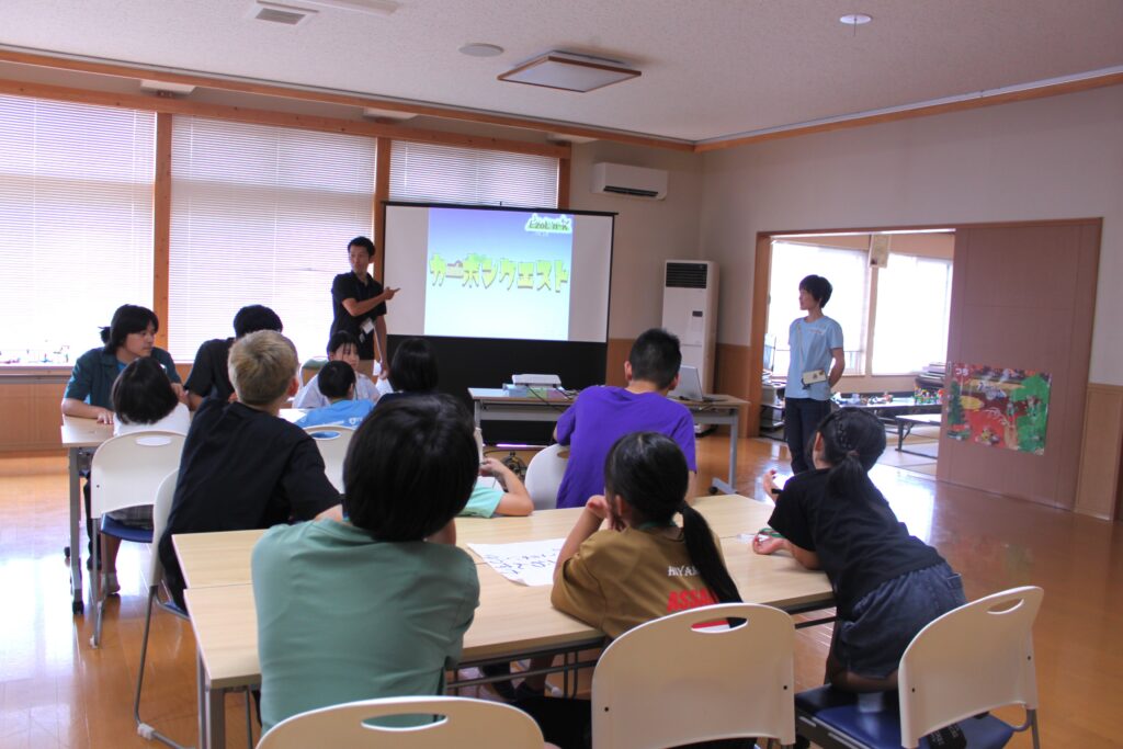 キャンプには厚沢部町と地域留学で同町に滞在する小学生を合わせて、合計40人(1回目:20人、2回目:20人)が参加し、キャンプの初日には、STの学生によるアイスブレイの後、エゾリンクが提供する脱炭素学習プログラム、「カーボンクエスト」と「レゴ®シリアスプレイ®」を組み合わせたワークショップを体験し、「炭素の旅」を通して人と自然のつながりを学びました。