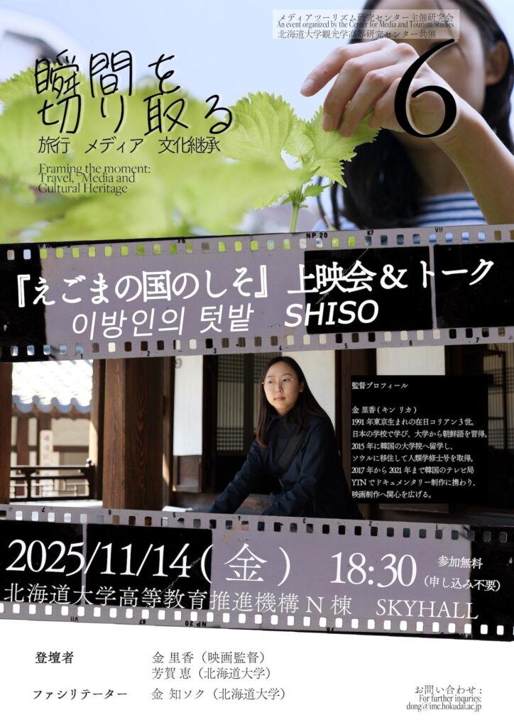 北海道大学メディア・コミュニケーション研究院附属メディア・ツーリズム研究センター主催「瞬間を切り取る:旅行、メディア、文化継承 6」「映画『えごまの国のしそ』 上映会&トーク」を11月14日に開催します。