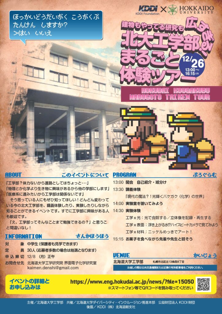 北海道大学工学部は、ダイバーシティ・インクルージョン推進本部及び公益財団法人KDDI財団共催のもと、「科学実験教室『北大工学部まるごと体験ツアー』」を12月26日に開催します。