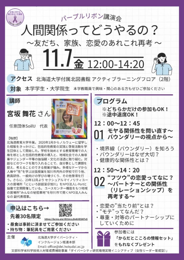 北海道大学ダイバーシティ・インクルージョン推進本部は、パープルリボン講演会『人間関係ってどうやるの?~友だち、家族、恋愛のあれこれ再考 ~』を11月7日に開催します。