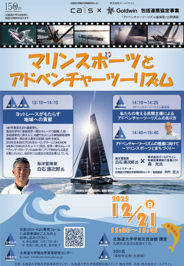 北海道大学観光学高等研究センター及び北海道大学国際広報メディア・観光学院は、株式会社ゴールドウインとの共催により、公開セミナー「マリンスポーツとアドベンチャーツーリズム」を12月21日に開催します。