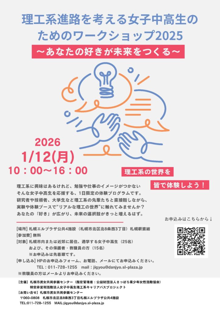 札幌市男女共同参画センター及び特定非営利活動法人女子中高生理工系キャリアパスプロジェクトは、「理工系進路を考える女子中高生のためのワークショップ~あなたの好きが未来をつくる~」を1月12日に開催します。