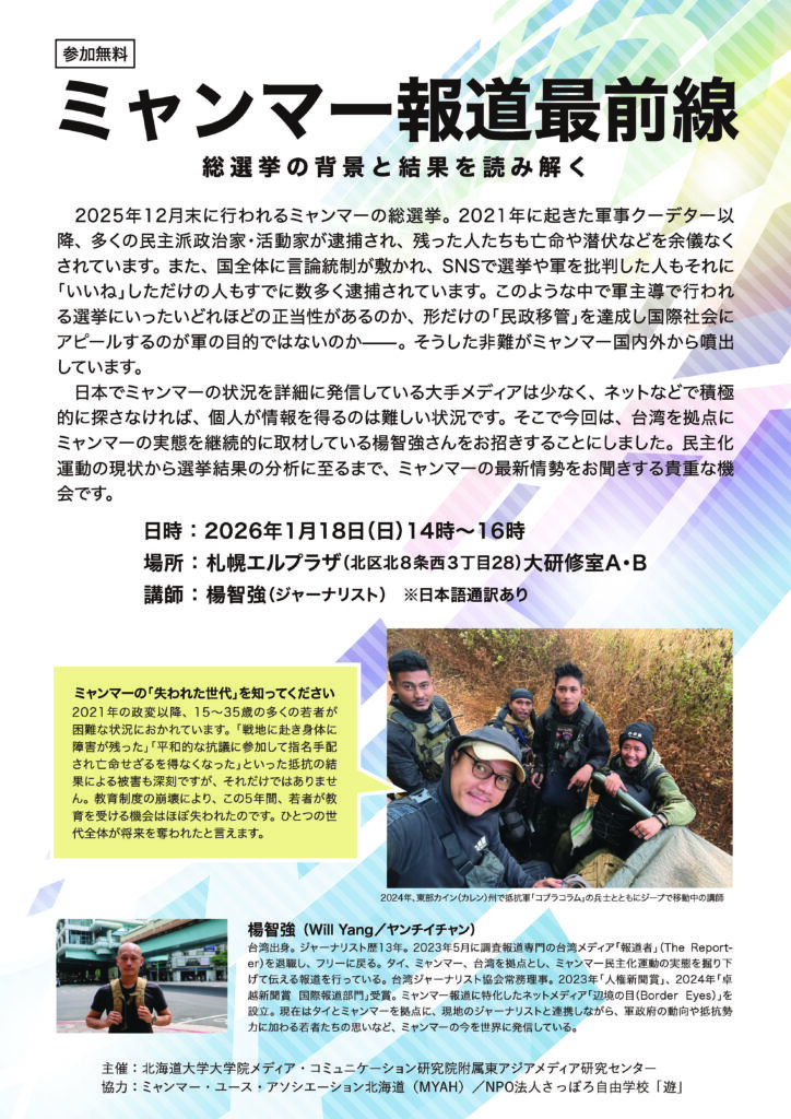 北海道大学メディア・コミュニケーション研究院附属東アジアメディア研究センターは、講演会「ミャンマー報道最前線 総選挙の背景と結果を読み解く」を1月18日に開催します。