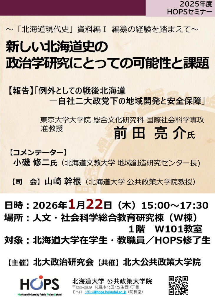 北大政治研究会は、北海道大学公共政策大学院共催のもと、2025年度HOPSセミナー「新しい北海道史の政治学研究にとっての可能性と課題」を1月22日に開催します。