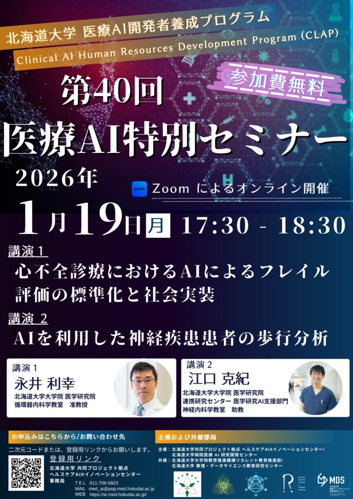 北海道大学 共同プロジェクト拠点 ヘルスケアAIXイノベーションセンター及び北海道大学病院 医療AI研究開発センターは、CLAP医療AI特別セミナー(第40回)を1月19日に開催します。