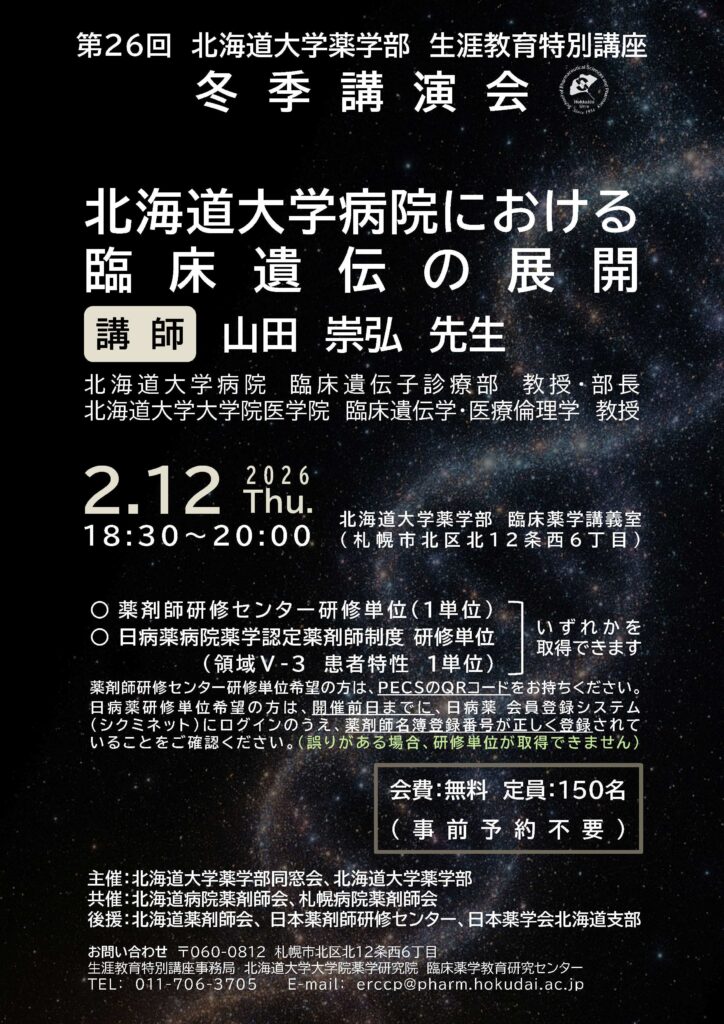 北海道大学薬学部同窓会及び北海道大学薬学部は、北海道病院薬剤師会及び札幌病院薬剤師会共催のもと「第26回生涯教育特別講座 冬季講演会」を2月12日に開催します。