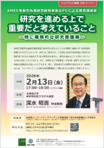 北海道大学統合URA本部は、北海道大学病院 医療・ヘルスサイエンス研究開発機構 臨床研究開発センターと共催のもと、AMED革新的先端研究開発事業のPOによる教育講演会」を2月13日に開催します。