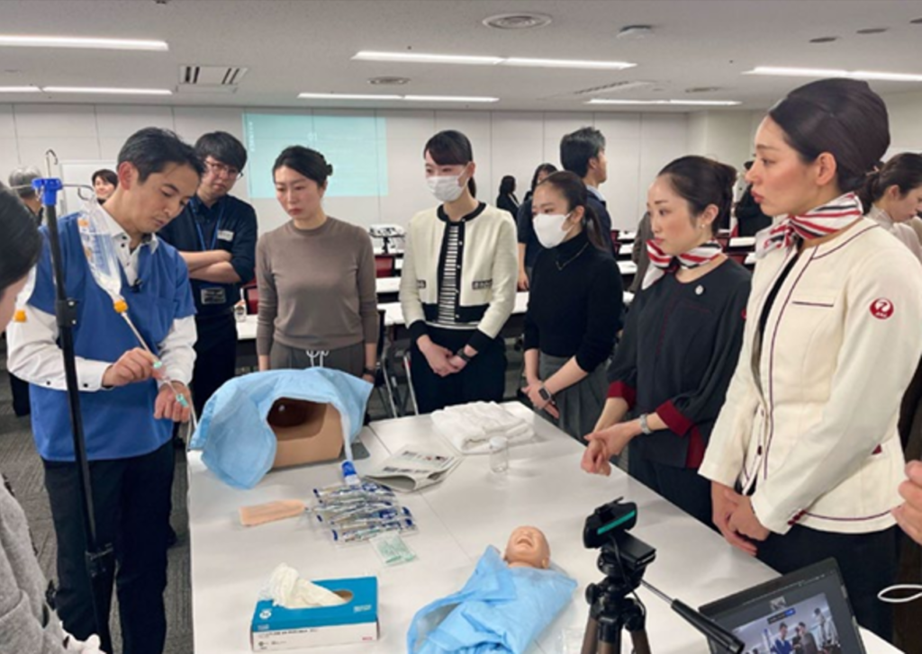 北海道大学と日本航空株式会社(以下「JAL」)は、「サステナブルな社会創り」をテーマとした連携協定に基づく協業の一環として、2025年11月19日(水)に、JAL客室乗務員向けの連携研修「妊婦のハイレベルケア」を羽田空港にて実施しました。