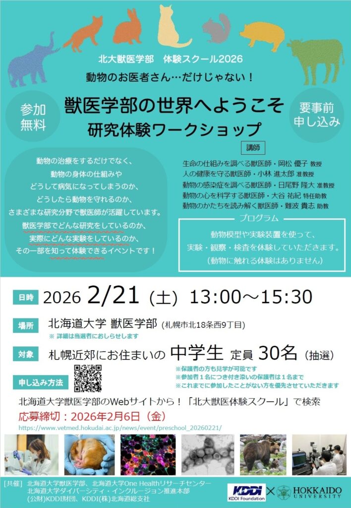 北海道大学獣医学部、One Healthリサーチセンター及びダイバーシティ・インクルージョン推進本部は共催で、中学生対象イベント「北大獣医学部 体験スクール2026」を2月21日に開催します。