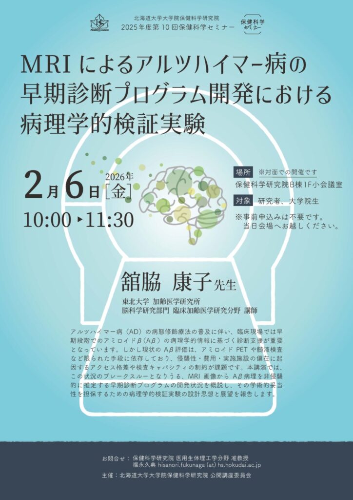 北海道大学保健科学研究院は、2025年度第10回保健科学セミナー 「MRI によるアルツハイマー病の早期診断プログラム開発における病理学的検証実験」を2月6日に開催します。