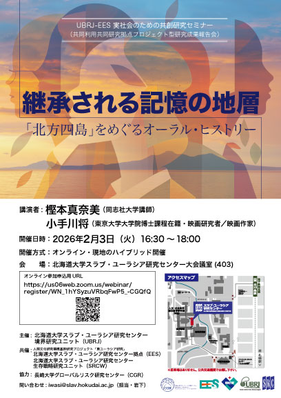 北海道大学 スラブ・ユーラシア研究センター境界研究ユニット(UBRJ)は、UBRJ/EES 実社会のための共創研究セミナー(共同利用共同研究拠点プロジェクト型研究成果報告会)「継承される記憶の地層:「北方四島」をめぐるオーラル・ヒストリー」を2月3日に開催します。