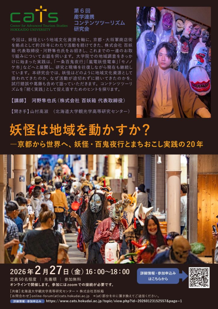 北海道大学観光学高等研究センターは、第6回産学連携コンテンツツーリズム「妖怪は地域を動かすか?~京都から世界へ、妖怪・百鬼夜行とまちおこし実践の20年」を2月27日に開催します。