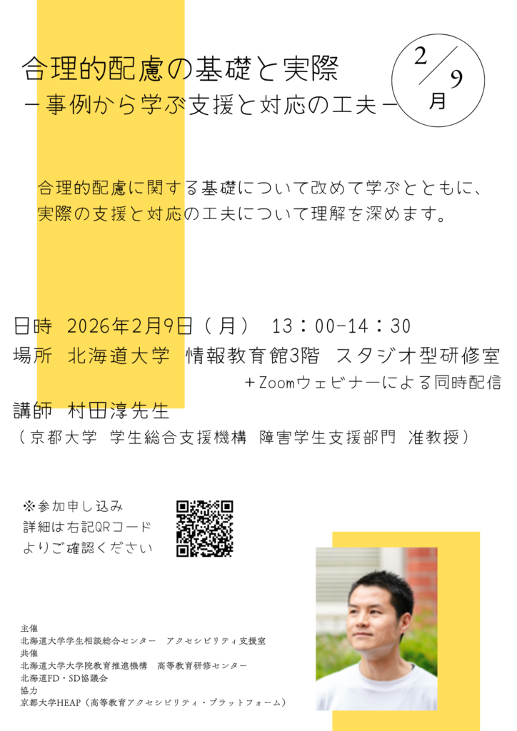 北海道大学学生相談総合センター アクセシビリティ支援室、及び高等教育研修センターは、共催で、「【FD/SD研修】合理的配慮の基礎と実際-事例から学ぶ支援と対応の工夫-」を2月9日に開催します。
