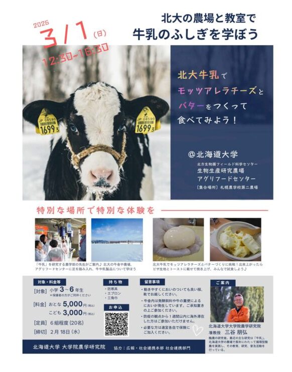 北海道大学大学院農学研究院は、3月1日(日)に、小学3年生から6年生を対象に「北大の農場と教室で牛乳のふしぎを学ぼう~北大牛乳でモッツァレラチーズとバターをつくって食べてみよう~」を開催します。