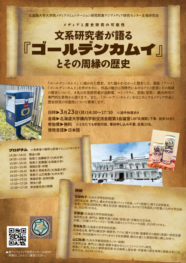北海道大学大学院メディア・コミュニケーション研究院附属東アジアメディア研究センターは、3月23日(月)に研究会「文系研究者が語る『ゴールデンカムイ』とその周縁の歴史――メディアと歴史研究の可能性――」を開催します。