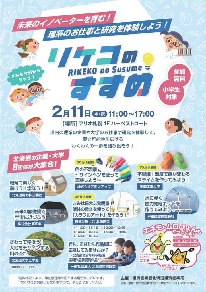 2月11日(水・祝)にアリオ札幌で開催される、小学生向けの理系体験イベント「理系の企業・大学のお仕事・研究体験イベント『リケコのすすめ』」(主催:経済産業省 北海道経済産業局)に、北海道大学工学部が出展します。