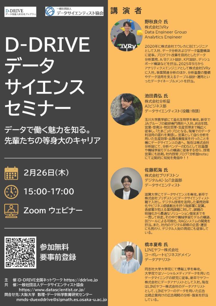 今回、文部科学省「D-DRIVE」とデータサイエンティスト協会が共同で、現場の最前線で活躍する4名を招いたオンラインセミナーを開催します。