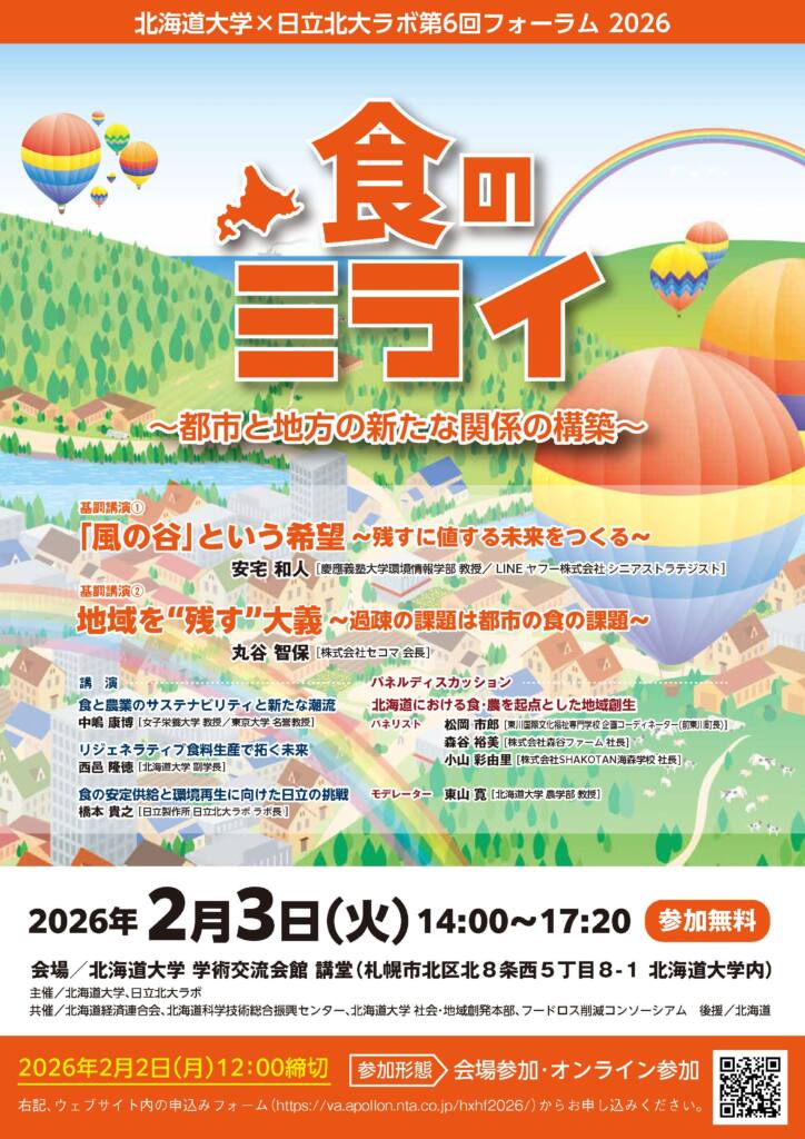 北海道大学、日立北大ラボは、北海道大学×日立北大ラボ 第6回フォーラム「食のミライ ~都市と地方の新たな関係の構築~」を2月3日(火)に開催します。