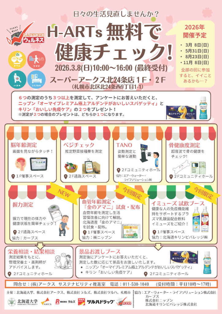 北海道大学、株式会社アークス、株式会社ラルズ、株式会社ツルハ及び札幌市の五者が進めるウェルネス推進プロジェクト「H-ARTs(ハーツ)」は、2026年も「無料で健康チェック!」(以下、本プログラム)を4回実施します。