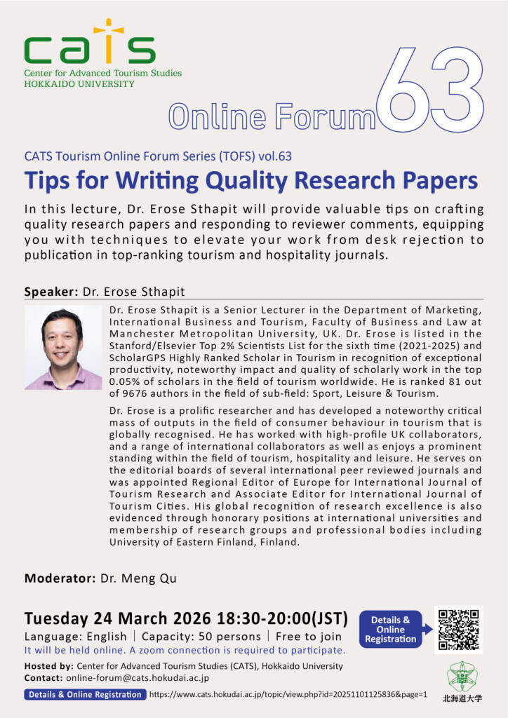 北海道大学観光学高等研究センター(CATS)は、3月24日(火)に観光オンラインフォーラムシリーズ(TOFS)vol.63を開催いたします。