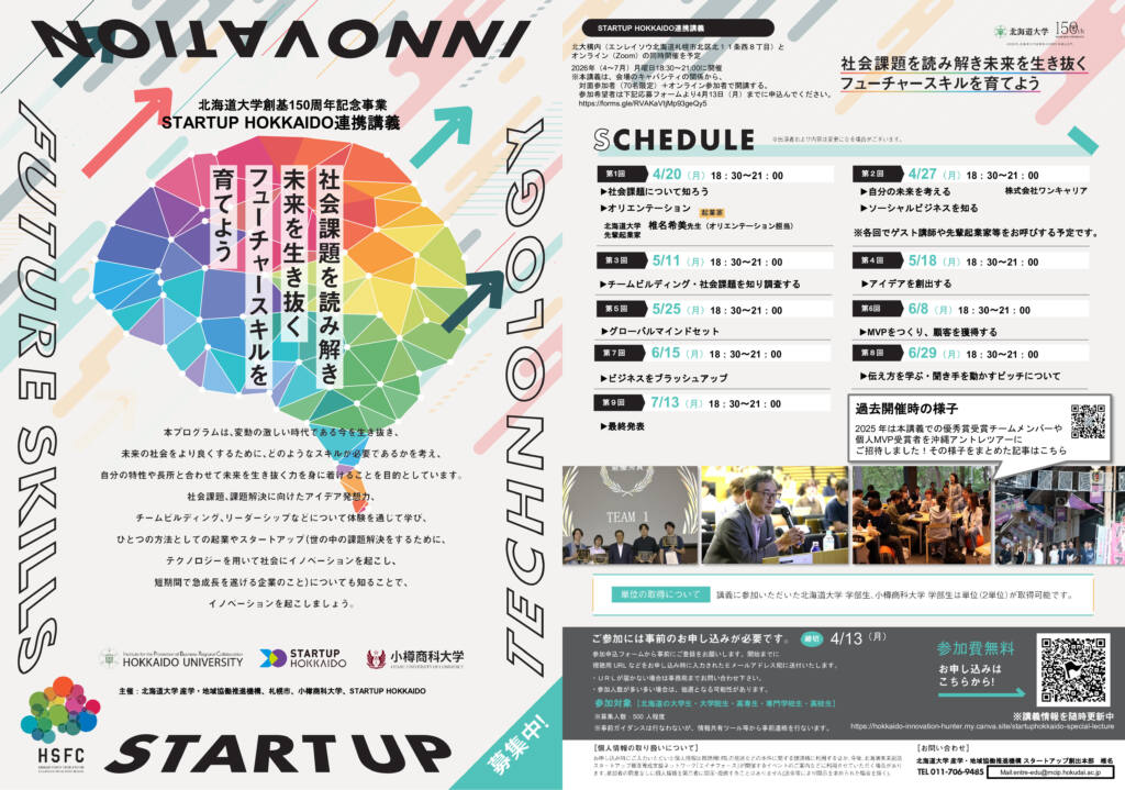 北海道大学 産学・地域協働推進機構、札幌市、小樽商科大学、STARTUP HOKKAIDOは、2026年4月20日から7月13日に「STARTUP HOKKAIDO連携講義 社会課題を読み解き、未来を生き抜くフューチャースキルを育てよう」を開催いたします。