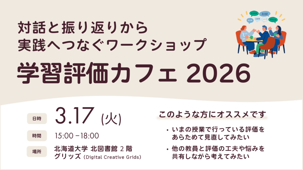 北海道大学 大学院教育推進機構 オープンエデュケーションセンターは、3月17日(火)に「学習評価カフェ2026― 対話と振り返りから実践へつなぐワークショップ ―」を開催いたします。