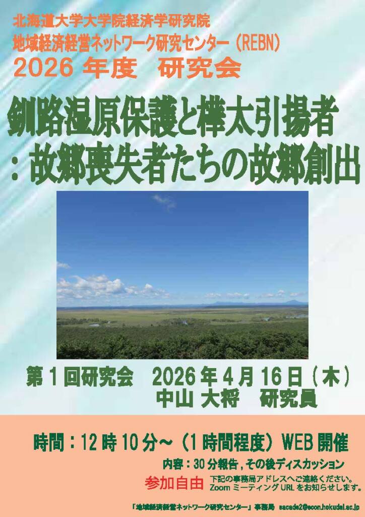 北海道大学経済学研究院地域経済経営ネットワーク研究センターは、2026年度第1回研究会を4月16日に開催します。