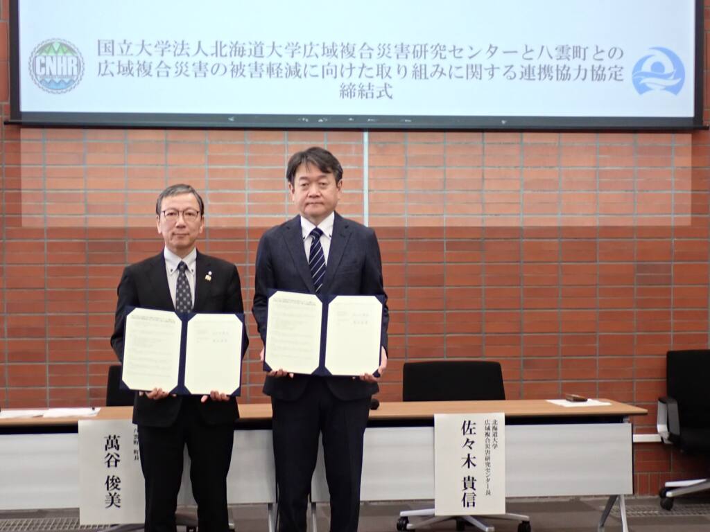 北海道大学広域複合災害研究センターは八雲町において、これまでに意見交換を行うとともに、令和7 年度には住民避難訓練の支援を実施しました。今後も八雲町及びその周辺地域における広域複合災害の被害軽減に資する研究活動や地域住民等への防災に関する啓発活動を円滑に実施していくため連携協力協定を締結し、大規模災害時の被害軽減に向けた取り組みを強化します。