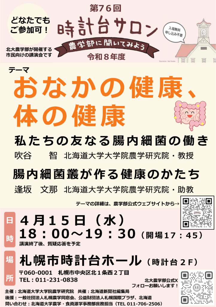北海道大学農学部・農学院・農学研究院では、札幌市時計台(正式名:旧札幌農学校演武場)において、「時計台サロン『農学部に聞いてみよう』」を開催しています。