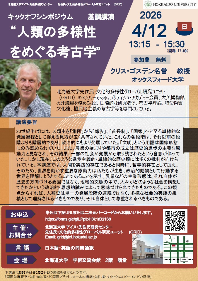 北海道大学 アイヌ・先住民研究センター 先住民・文化的多様性グローバル研究ユニット(GRID)は、2026年4月12日(日)にキックオフシンポジウム 基調講演「人類の多様性をめぐる考古学」クリス・ゴスデン名誉教授(オックスフォード大学)を開催いたします。