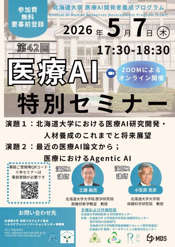 北海道大学 共同プロジェクト拠点 ヘルスケアAIXイノベーションセンター、北海道大学病院 医療AI研究開発センターは、5月7日(木)に第42回医療AI特別セミナーを開催します。