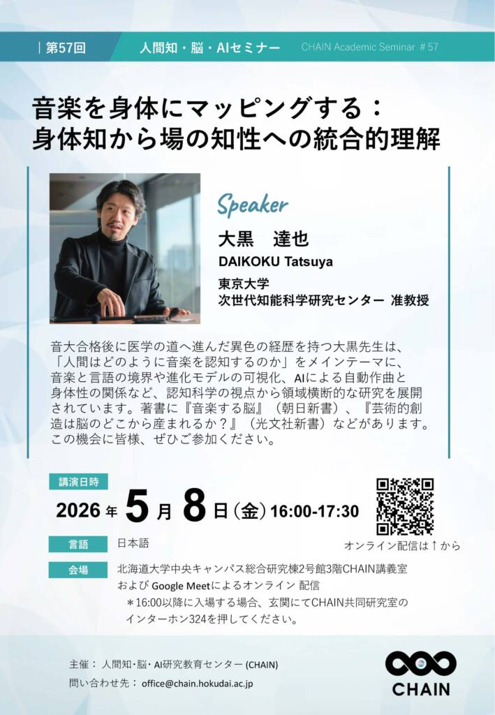 北海道大学人間知×脳×AI研究教育センター(CHAIN)は、5月8日(金)に第57回人間知・脳・AIセミナー(CHAIN Academic Seminar #57)「音楽を身体にマッピングする:身体知から場の知性への統合的理解」を開催します。