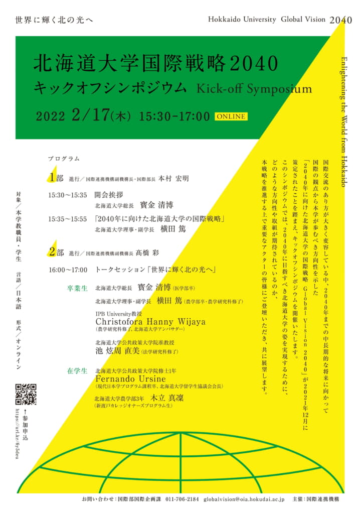 北海道大学国際連携機構は「北海道国際戦略2040キックオフシンポジウム~世界に輝く北の光」を開催します。