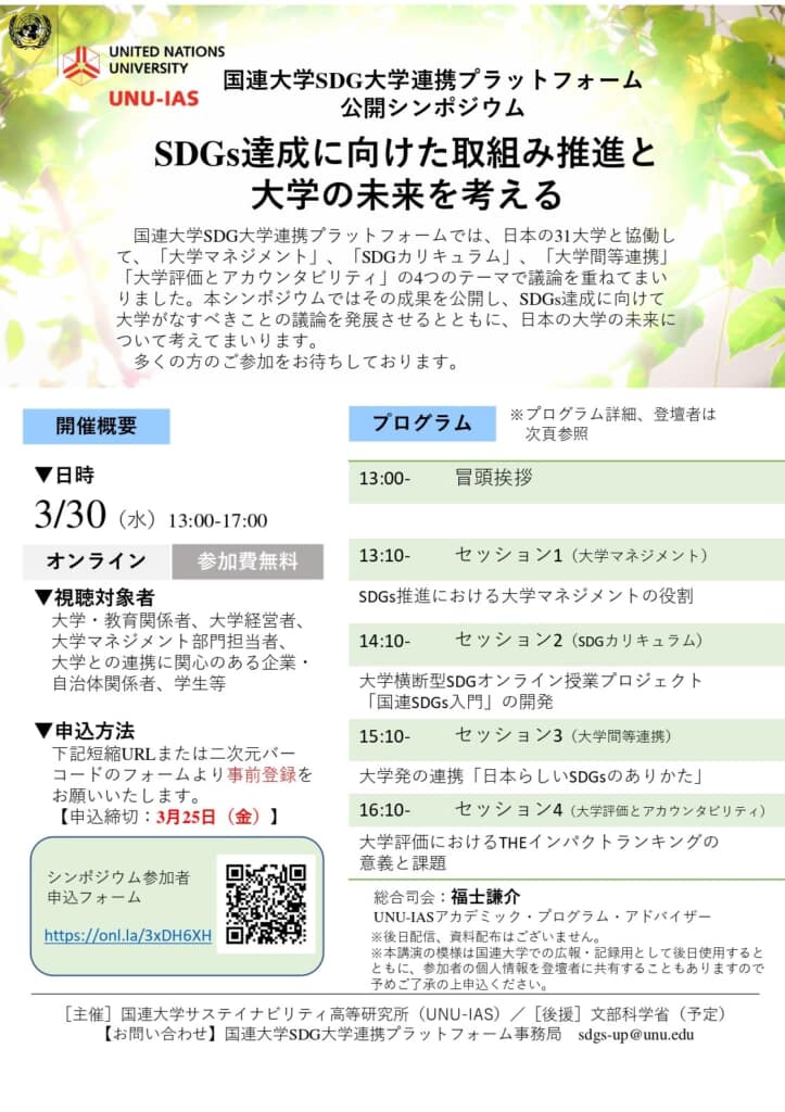 本学が参加する国連大学SDG大学連携プラットフォームは公開シンポジウム「SDGs達成に向けた取組み推進と大学の未来を考える」を3月30日に開催します。