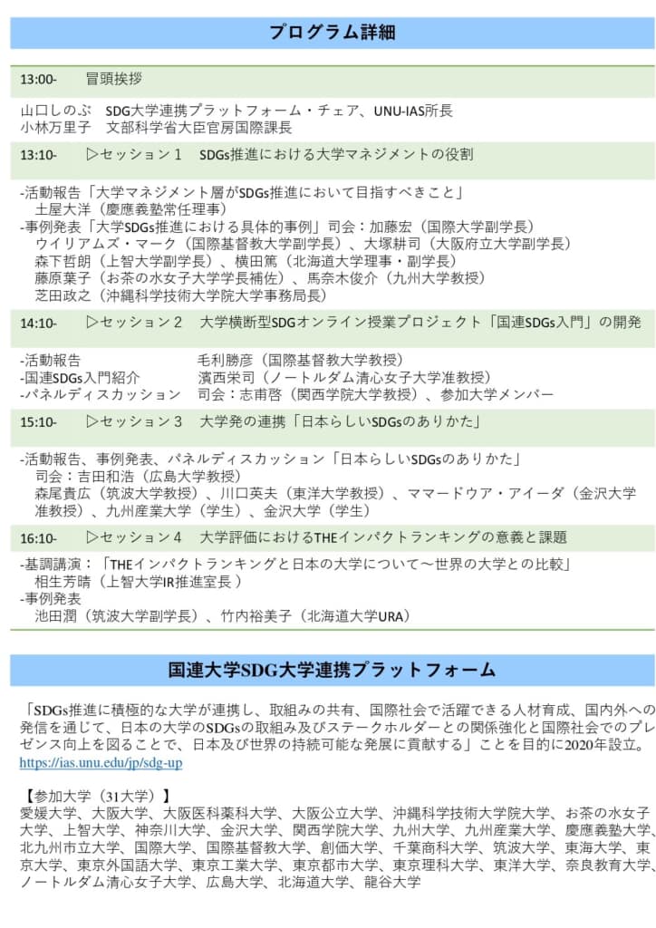 本学からは、セッション1「SDGs推進における大学マネジメントの役割」で横田篤理事・副学長が、セッション4「大学評価におけるTHEインパクトランキングの意義と課題」で竹内裕美子URAが発表を予定しています。