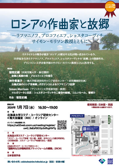 北海道大学スラブ・ユーラシア研究センター「スラブ・ユーラシア地域(旧ソ連・東欧)を中心とした総合的研究」は、シンポジウム「 ロシアの作曲家と故郷―ラフマニノフ、プロコフィエフ、ショスタコーヴィチ― サイモン・モリソン教授とともに」を1月7日に開催します。