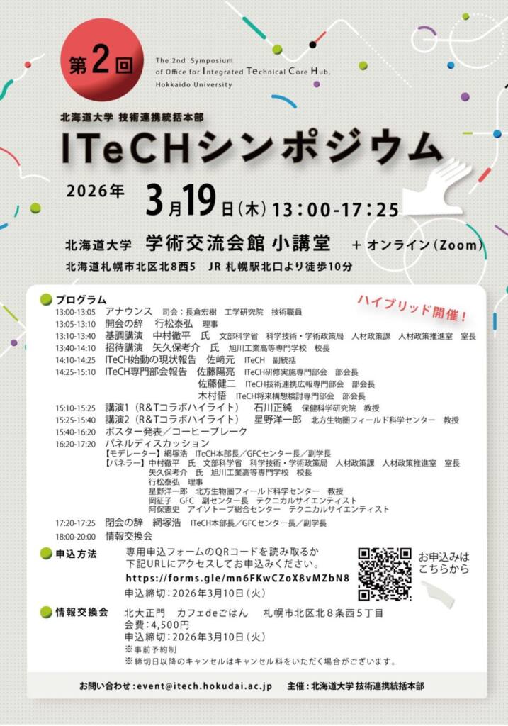 北海道大学技術連携統括本部(ITeCH)は、3月19日(木)に、第2回北海道大学技術連携統括本部 ITeCHシンポジウム を開催します。