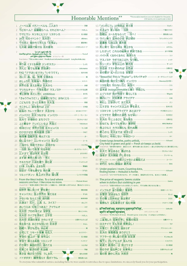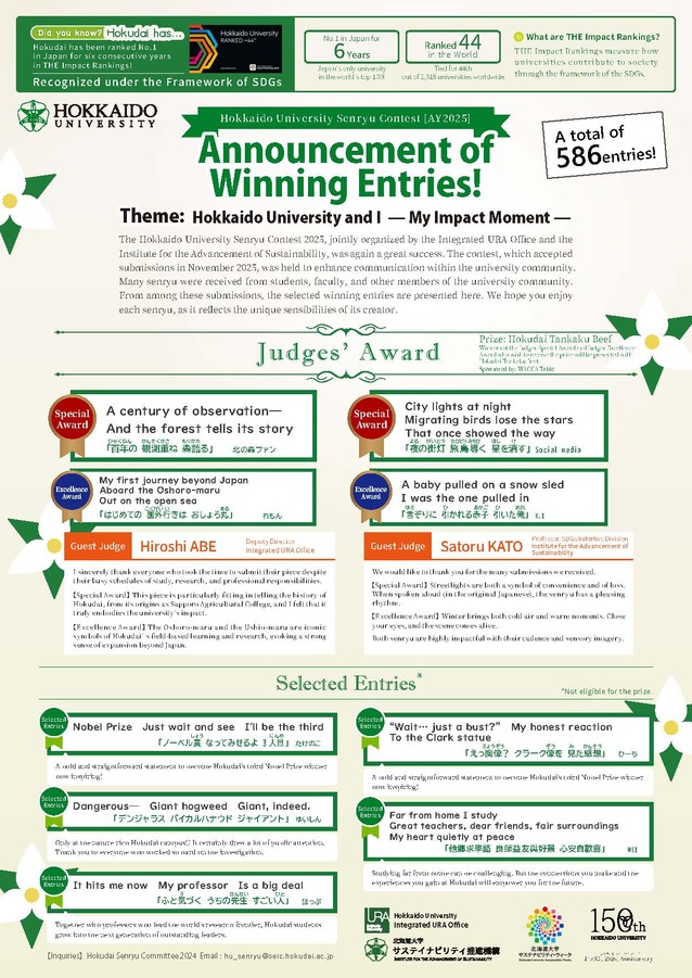 The Hokkaido University Senryu Contest 2025, jointly organized by the Integrated URA Office and the Institute for the Advancement of Sustainability, was again a great success. The contest, which accepted submissions in November 2025, was held to enhance communication within the university community.